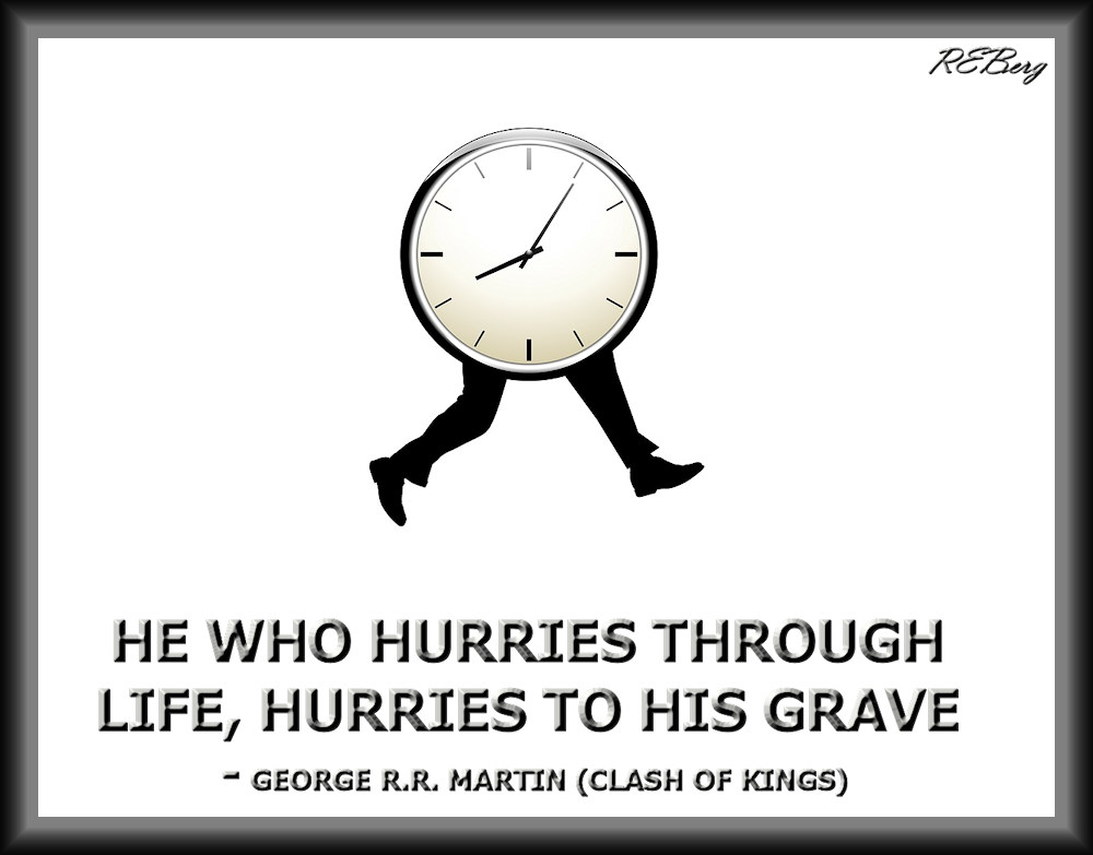 Dead-End Rush Image July 21, 2023 R.E. Berg Deadly Living, humor, joke, Lively Dying, meme, Quote Quotient, Ready Reading Clash of Kings, clock, George R.R. Martin, grave, hurry, legs, life