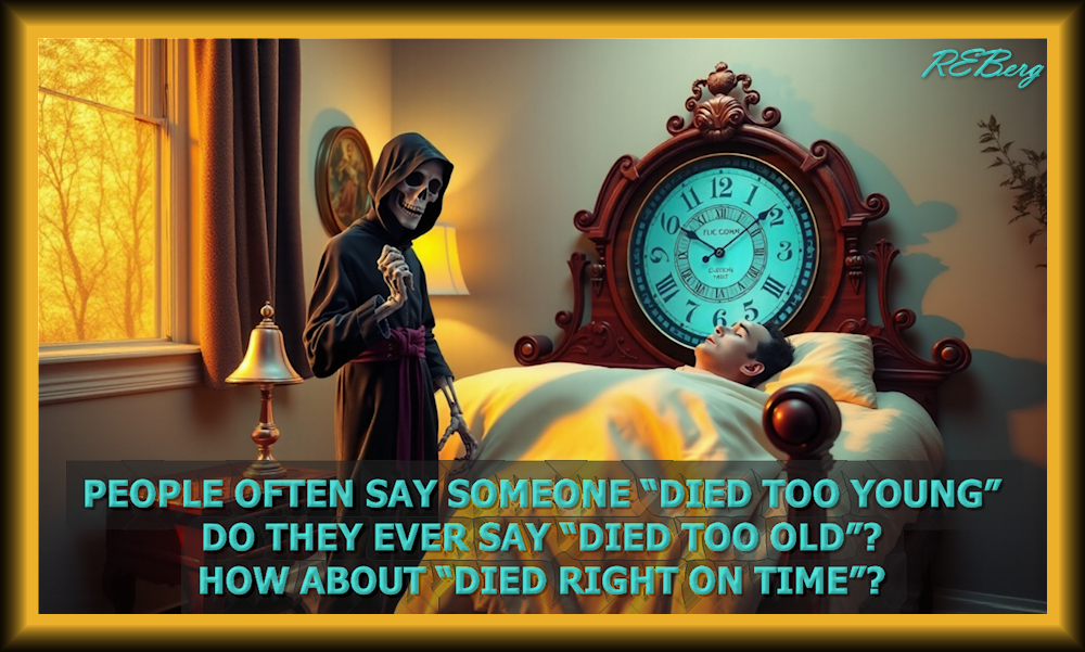ETD Image April 10, 2025 R.E. Berg Age Management, Deadly Living, humor, Imaginary Reality, joke, Lively Dying, meme, Random Observations clock, death, deathbed, died right on time, died too old, died too young, grim reaper, man