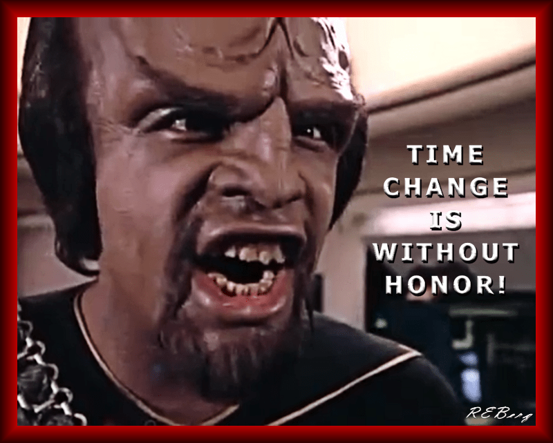 Untimely Ire Image March 12, 2023 R.E. Berg humor, joke, Marginal Entertainment, meme, Special Days anger, change, clocks, daylight, honor, Klingon, saving, Star Trek, time, without, Worf