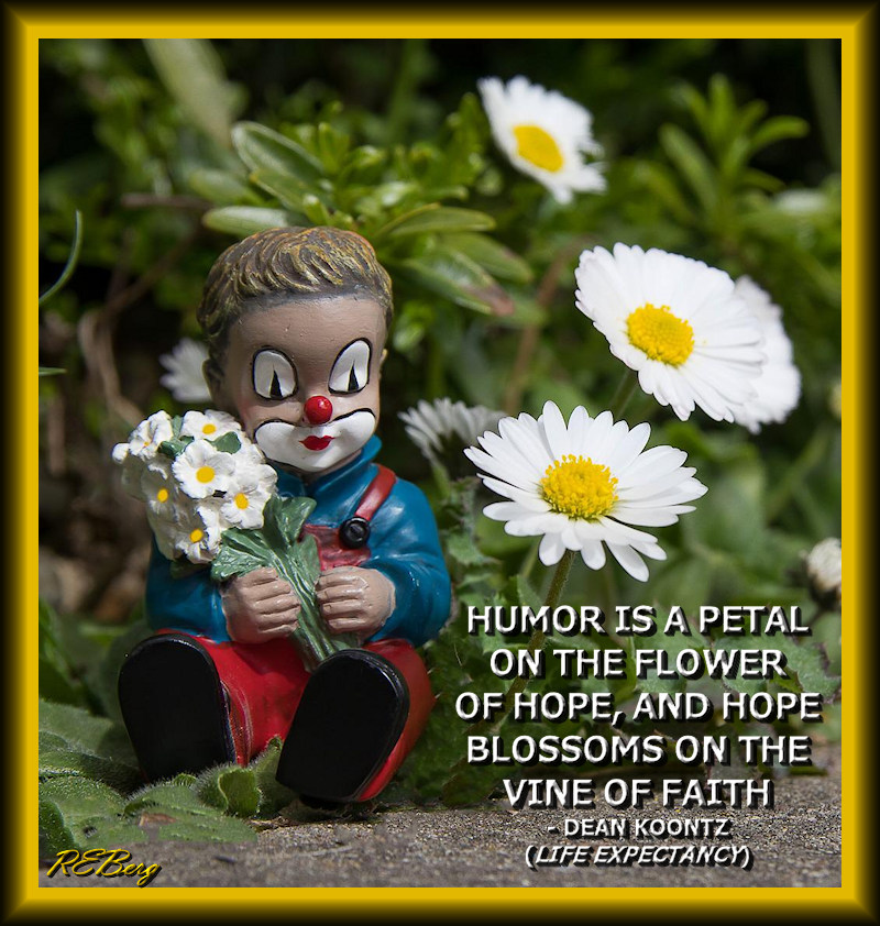 Poetic Prose Image August 14, 2023 R.E. Berg humor, meme, Quote Quotient, Ready Reading blossom, clown, Dean Koontz, faith, flower, hope, petal, vine