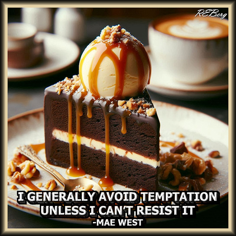 No Choice Image February 6, 2025 R.E. Berg Culinary Curiosities, Deadly Living, humor, joke, meme, Quote Quotient, Random Observations avoid temptation, can't resist, caramel, chocolate cake, coffee, dessert, generally, ice cream, Mae West, nuts, unless