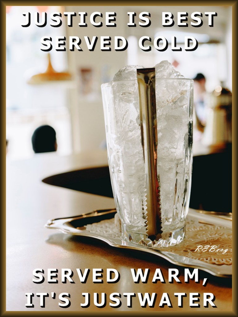 Freeze Before Serving Image October 24, 2023October 24, 2023 R.E. Berg Culinary Curiosities, humor, joke, meme, Punishingly Punny, Random Observations cold, ice, just, just water, justice, served, warm