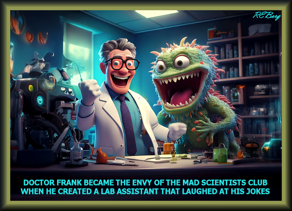 Comic Companion Image May 5, 2025 R.E. Berg Companion Critters, humor, Imaginary Reality, joke, Marginal Entertainment, meme, Occupational Oddities, That's Living created, doctor, envy, lab assistant, laughed at his jokes, Mad Scientists Club, monster