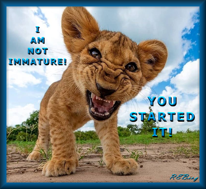 Did Not! Image November 1, 2023 R.E. Berg humor, joke, meme, Rocky Relationships, Social Hostility argument, cub, immaturity, lion, started