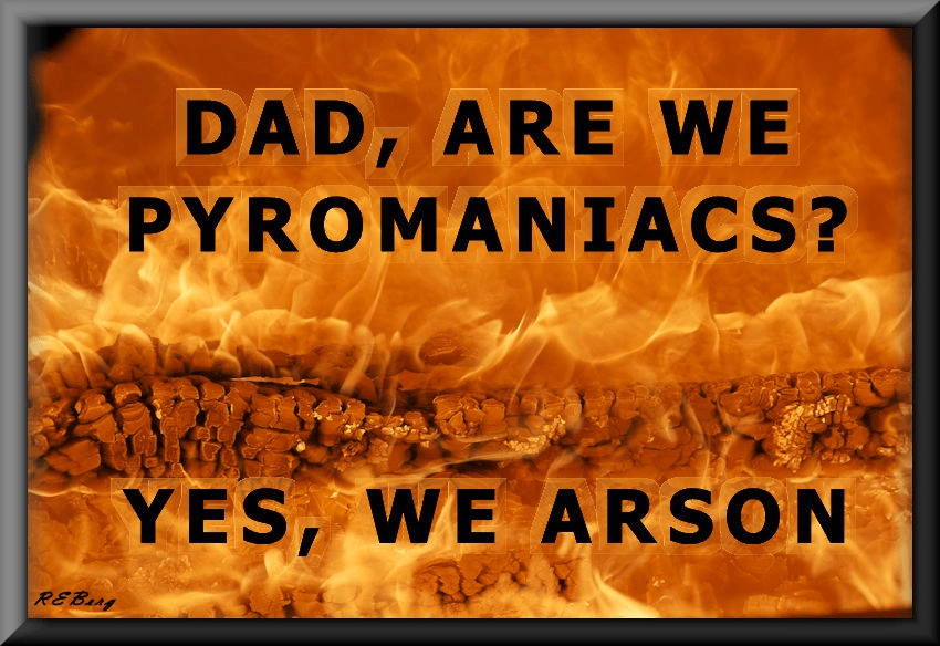 Incendiary Heritage Image March 24, 2023 R.E. Berg humor, Improper Parenting, joke, meme, Punishingly Punny are, arson, dad, pyromaniac