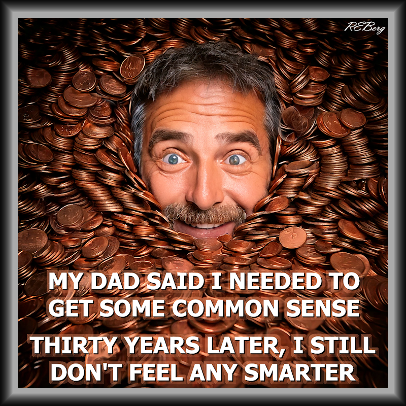 No Cents Of Accomplishment Image February 26, 2025 R.E. Berg Fanciful Finances, humor, Improper Parenting, joke, meme, Punishingly Punny Too, Rocky Relationships accumulation, cents, collection, dad, feel, man, pennies, smarter, thirty, years