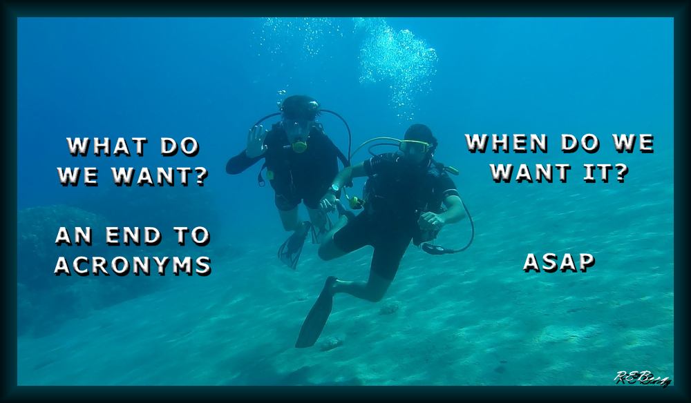 SCUBA SOS Image January 13, 2023 R.E. Berg humor, Irrational Recreation, joke, meme, Punishingly Punny Too acronyms, ASAP, demand, divers, end