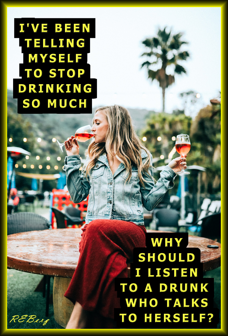 Questionable Advisor Image February 18, 2023 R.E. Berg Culinary Curiosities, humor, joke, meme, Mental Gymnastics drinking, drunk, herself, listen, much, stop, talks, telling, why