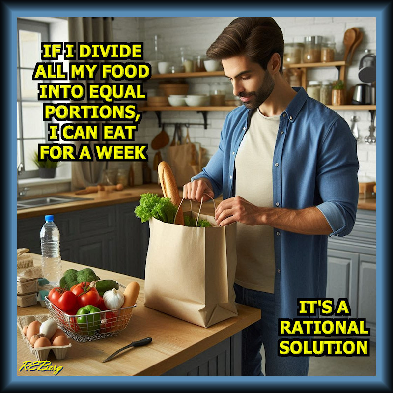 Divide And Conquer Image June 16, 2024June 16, 2024 R.E. Berg Culinary Curiosities, Fanciful Finances, humor, joke, meme, Methodic Mathematics, Punishingly Punny, That's Living all, bag, divide, eat, equal, food, grocery, man, portions, ration, rational, solution, week