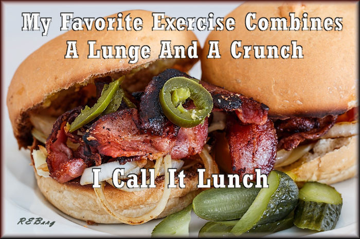 Building Critical Mass Image August 12, 2023 R.E. Berg Culinary Curiosities, Fantasy Fitness, humor, joke, meme, Punishingly Punny bacon, burger, crunch, exercise, favorite, jalapeños, lunch, lunge, pickles