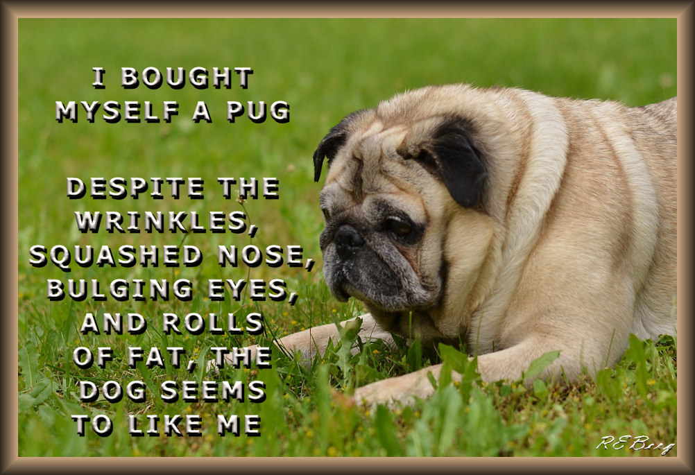 Lookalikes Image December 29, 2023 R.E. Berg Companion Critters, humor, joke, meme, Punishingly Punny bulging, eyes, fat, nose, Pug, resemblance, rolls, squashed, wrinkles