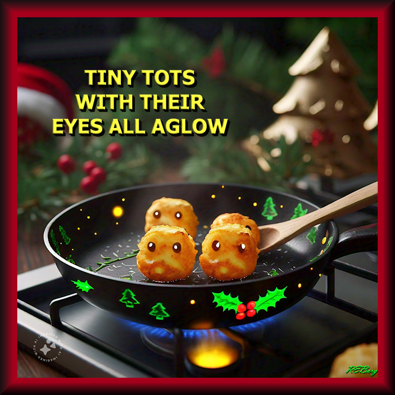 The Shining Image December 21, 2024December 21, 2024 R.E. Berg Culinary Curiosities, humor, joke, Marginal Entertainment, meme, Musical Mayhem, Punishingly Punny Too, Special Days all aglow, Carol, Christmas decor, eyes, frying pan, Tater Tots, tiny, tots
