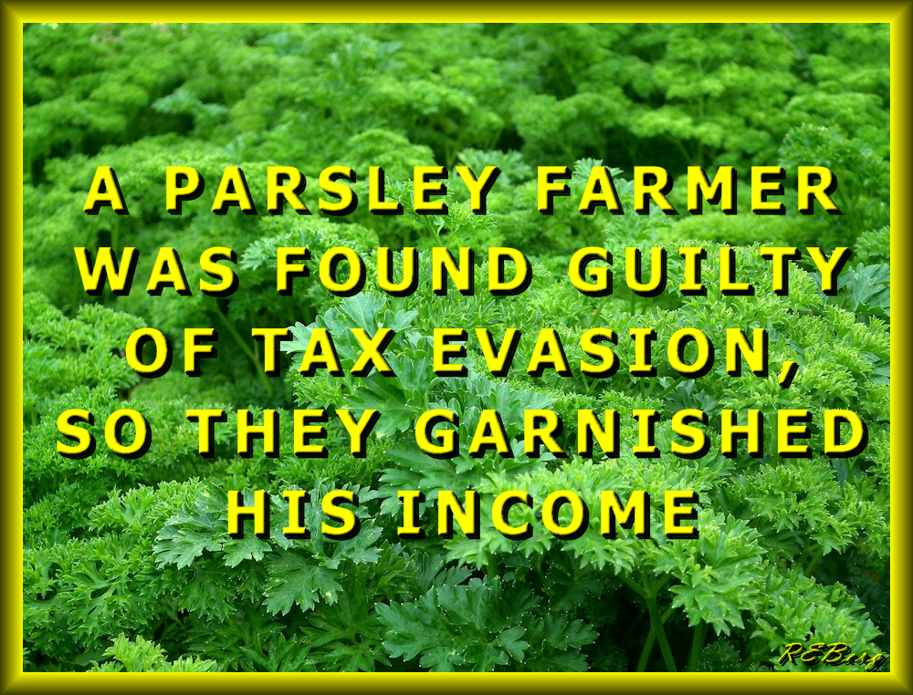 Seasonal Decision Image April 25, 2023 R.E. Berg Agricultural Acumen, humor, joke, meme, Punishingly Punny Too evasion, farmer, garnished, income, parsley, tax