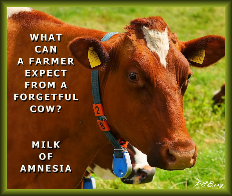 Bovine Bafflement Image December 13, 2023 R.E. Berg Agricultural Acumen, humor, joke, meme, Punishingly Punny amnesia, cow, expectations, farmer, forgetful, magnesia, milk