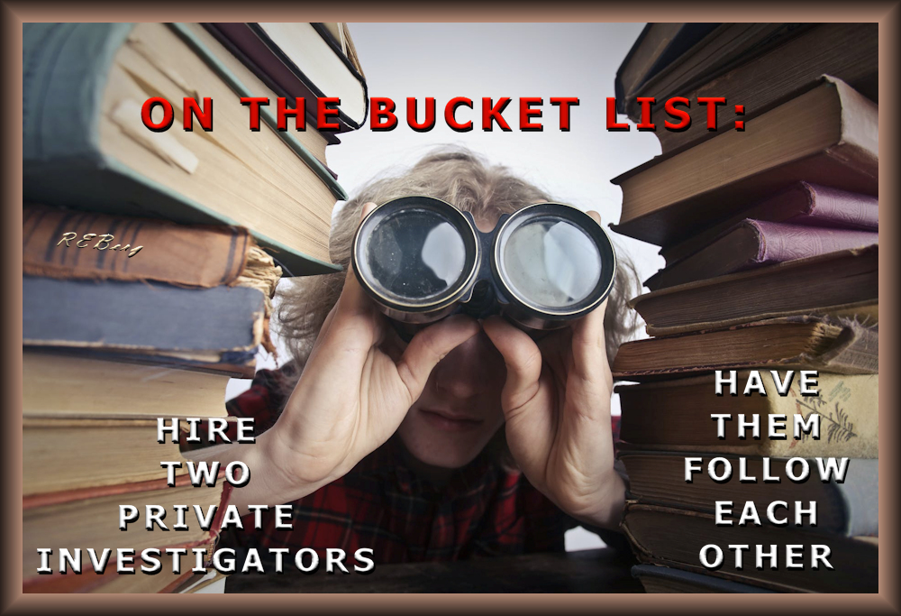 Double Agents Image January 20, 2023 R.E. Berg humor, joke, meme, Mental Gymnastics, Social Hostility binoculars, bucket, follow, investigators, list, private