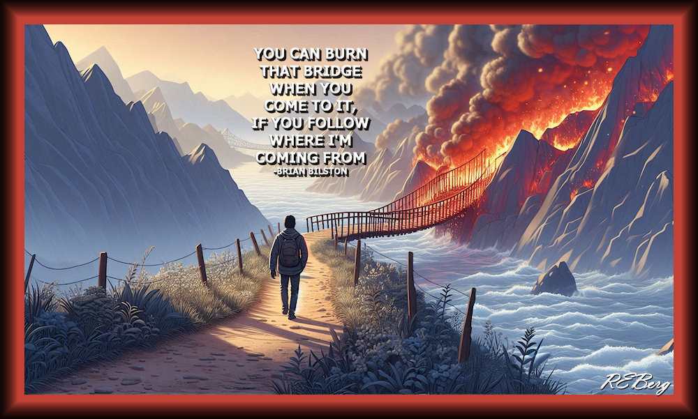 Firewalker Image October 27, 2024 R.E. Berg Deadly Living, humor, joke, meme, Mental Gymnastics, Punishingly Punny, Quote Quotient, Rocky Relationships, Social Hostility, Travel Trauma Brian Bilston, bridge, burn, come, cross, follow, where