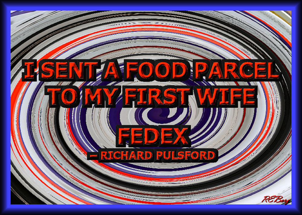 Ex Fed Image October 24, 2023 R.E. Berg Culinary Curiosities, humor, joke, meme, Punishingly Punny, Quote Quotient, Rocky Relationships ex, fed, FedEx, food, package, parcel, Richard Pulsford, sent, wife