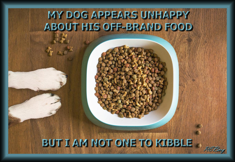No Substitutions! Image June 26, 2023 R.E. Berg Companion Critters, Culinary Curiosities, humor, joke, meme, Punishingly Punny Too dog, food, kibble, off-brand, quibble, unhappy