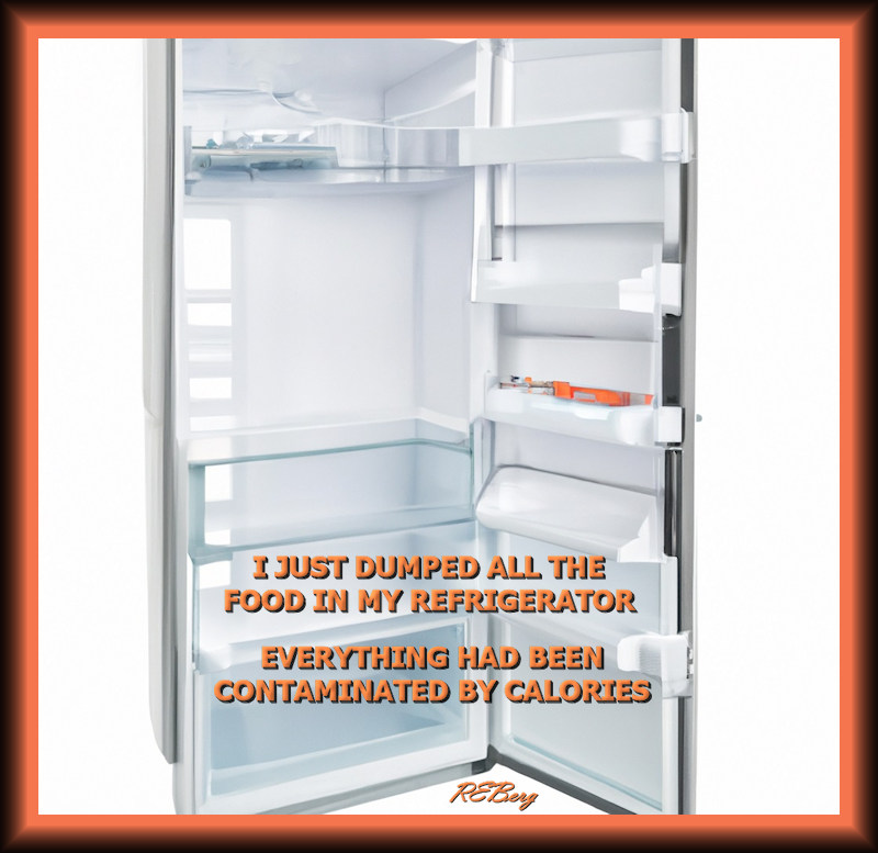 Calorific Calamity Image July 8, 2023 R.E. Berg Culinary Curiosities, humor, joke, meme calories, contaminated, dumped, food, refrigerator