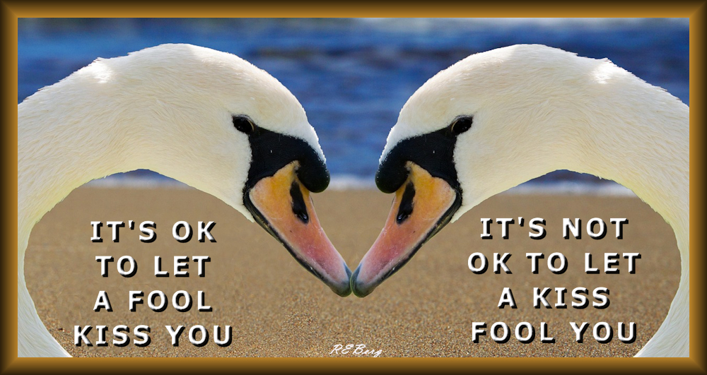 Foolish Advice Image October 7, 2023 R.E. Berg humor, joke, meme, Punishingly Punny, Rocky Relationships fool, kiss, lovebirds, OK, swans