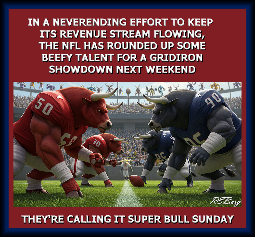 Fear The Steer Image February 10, 2025 R.E. Berg humor, Imaginary Reality, Irrational Recreation, joke, Marginal Entertainment, meme, Punishingly Punny, Special Days beefy talent, bulls, flowing, football, gridiron showdown, lineup, neverending effort, next weekend, NFL, revenue stream, rounded up, Sunday, super bowl, super bull