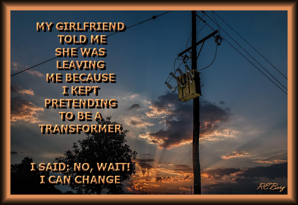 Metamorphic Response Image May 28, 2023 R.E. Berg humor, joke, Marginal Entertainment, meme, Punishingly Punny, Rocky Relationships change, girlfriend, leaving, pretending, Transformer