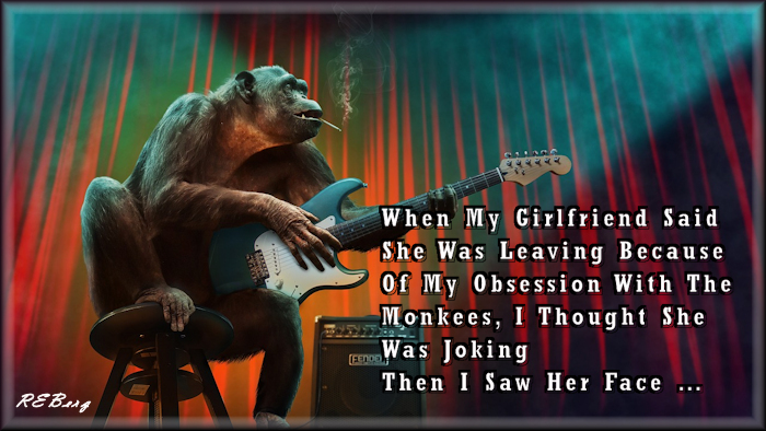 Image February 18, 2023 R.E. Berg humor, joke, Marginal Entertainment, meme, Musical Mayhem, Rocky Relationships escape, face, girlfriend, guitar, I'm A Believer, joking, leaving, Monkees, obsession, saw, thought