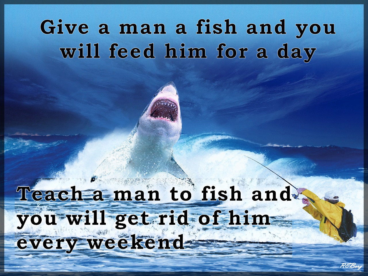 Absent Angler Image May 2, 2023 R.E. Berg humor, Irrational Recreation, joke, meme, Rocky Relationships feed, fishing, give, man, rid, shark, teach, weekend
