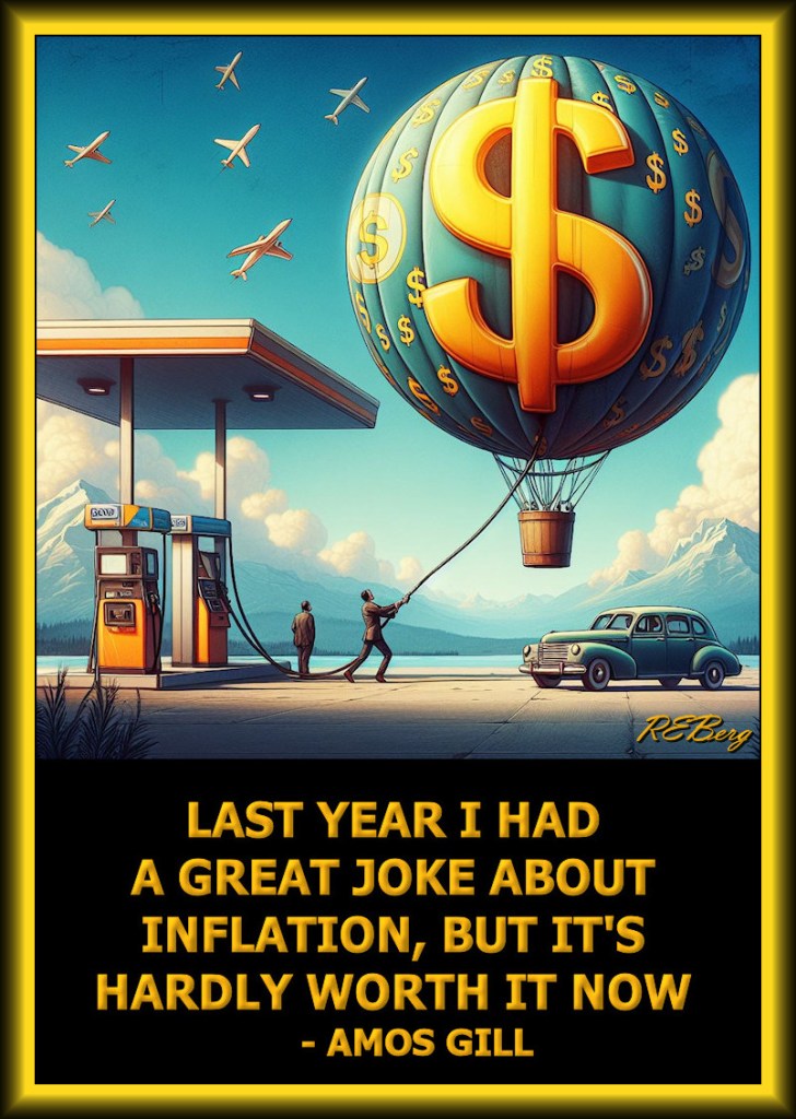 Never Mind Image April 28, 2024 R.E. Berg Fanciful Finances, humor, joke, meme, Quote Quotient Amos Gill, great, hardly, inflation, joke, last, now, worth it, year