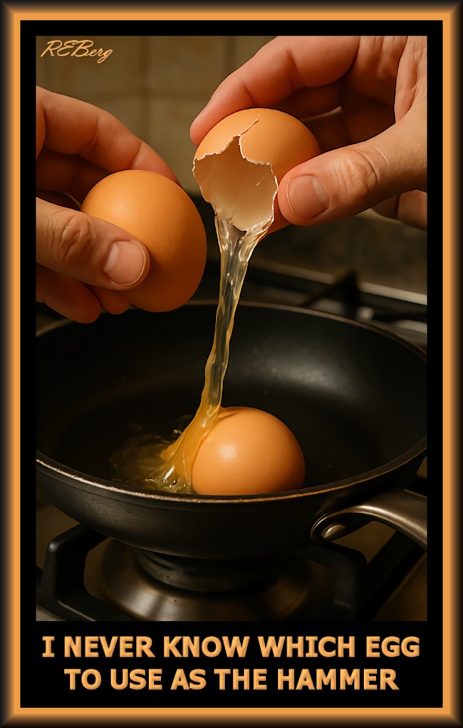 Beating The Odds Image May 12, 2025 R.E. Berg Culinary Curiosities, humor, joke, meme, Random Observations, Rocky Relationships cracking, decision, frying pan, hammer, never know, which egg