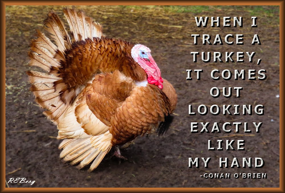 Poultry Reproduction Image November 23, 2023 R.E. Berg Agricultural Acumen, humor, joke, meme, Mental Gymnastics, Quote Quotient, Special Days Conan O'Brien, hand, Thanksgving, trace, turkey