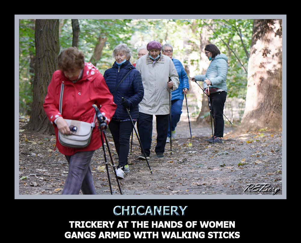 Deviant Definition – Chicanery Image March 31, 2023 R.E. Berg humor, Irrational Recreation, joke, meme, Punishingly Punny armed, canes, chicks, gangs, hands, trickery, walking sticks, women