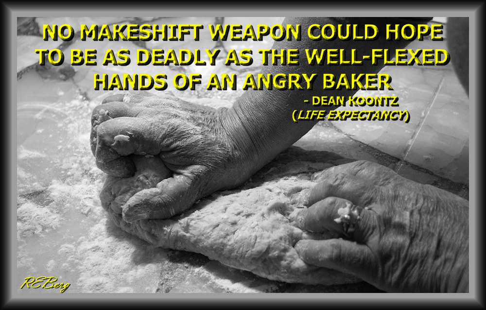 Fearsome Fingers Image August 12, 2023 R.E. Berg Culinary Curiosities, Deadly Living, humor, joke, meme, Occupational Oddities, Quote Quotient angry, baker, deadly, Dean Koontz, hands, makeshift, weapon, well-flexed