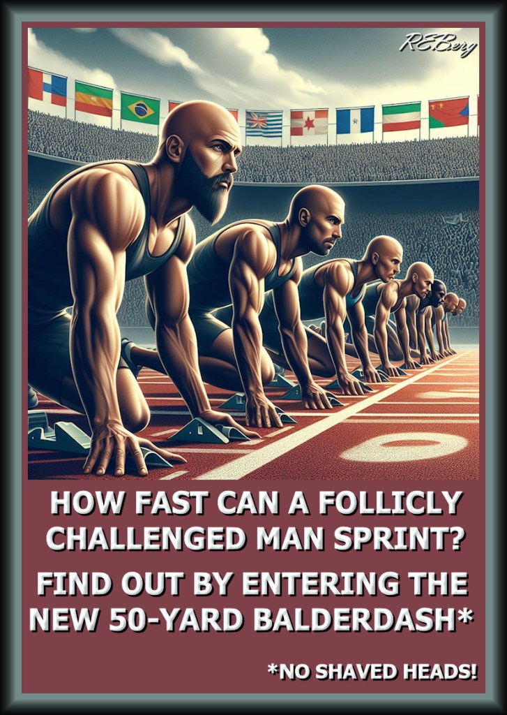 Streamlined Lineup Image May 3, 2024 R.E. Berg Fantasy Fitness, humor, Irrational Recreation, joke, meme, Punishingly Punny Too 50-yard, balderdash, challenged, dash, fast, follically, heads, man, shaved, sprint