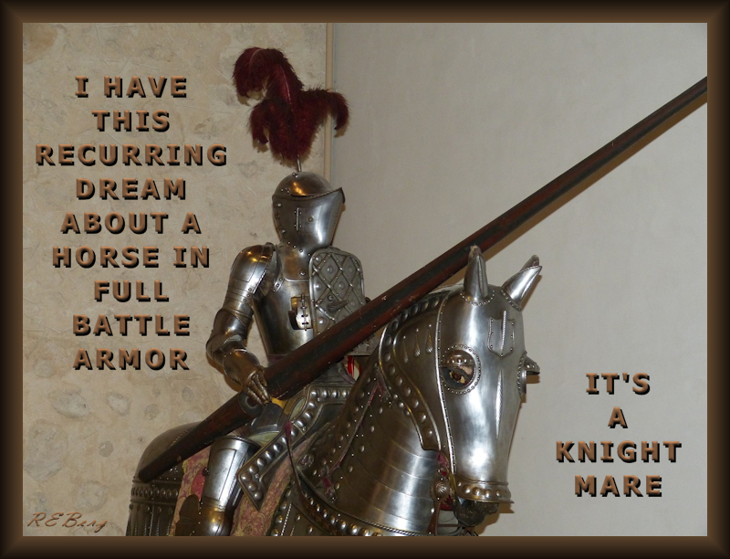 Knight Rider Image December 12, 2023 R.E. Berg humor, Imaginary Reality, joke, meme, Occupational Oddities, Punishingly Punny, Travel Trauma armor, battle, dream, horse, humor, joke, knight mare, nightmare, pun, recurring