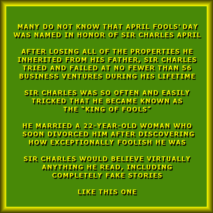 Holiday With A History Image April 1, 2023 R.E. Berg humor, joke, meme, Special Days April Fools Day, foolish, humor, joke, King Of Fools, Sir Charles April