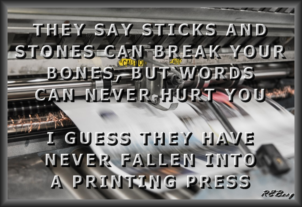 Painful Exception Image May 23, 2023 R.E. Berg humor, joke, meme, Punishingly Punny Too, Random Observations bones, break, fallen, hurt, never, press, printing, sticks, stones, words