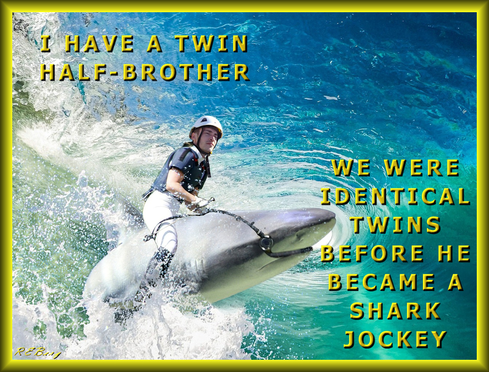 Jumping The Rider Image October 9, 2023 R.E. Berg Deadly Living, humor, Irrational Recreation, joke, meme, Punishingly Punny half-brother, identical, jockey, shark, twin