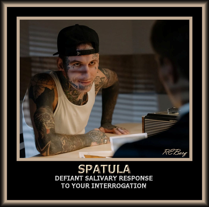 Deviant Definition – Spatula Image April 1, 2023 R.E. Berg humor, Ill Legalities, joke, meme, Punishingly Punny defiant, interrogation, response, salivary, spat at you, spat atcha, spit, spittle