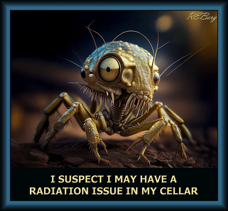 Radiant Roach Image March 15, 2025 R.E. Berg Companion Critters, humor, Imaginary Reality, joke, meme, Random Observations, Scientific Sensibility, That's Living bugged, cellar, gold-bug, insect, issue, metallic, mutant, radiation, radon