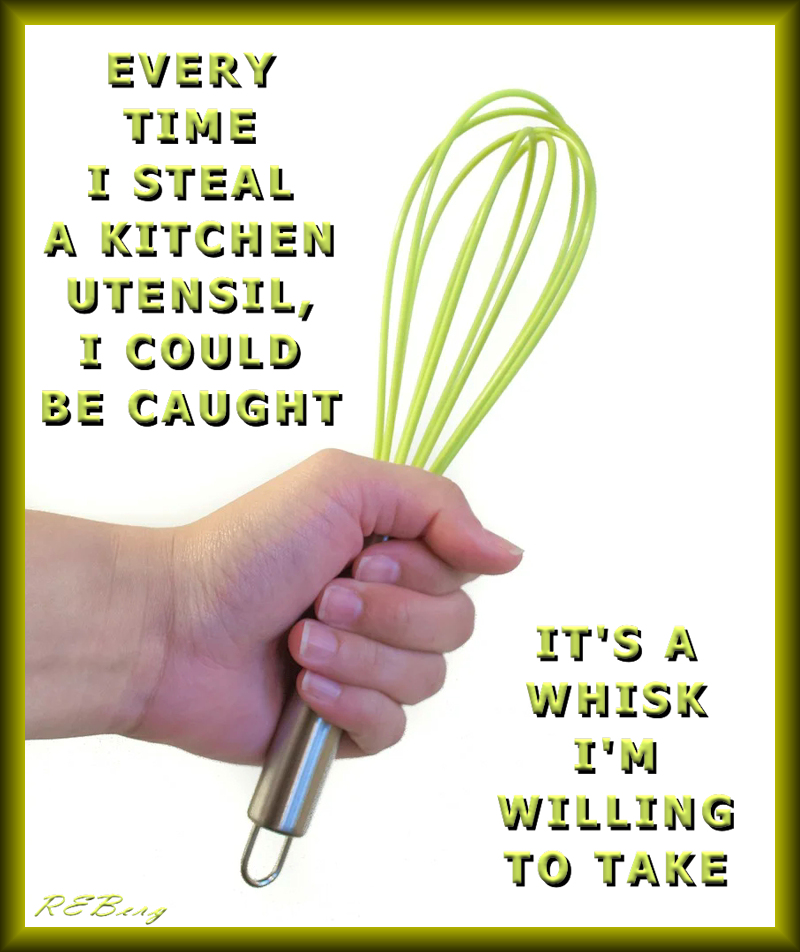 Whisky Business Image December 12, 2023December 12, 2023 R.E. Berg Culinary Curiosities, humor, Ill Legalities, joke, meme, Punishingly Punny Too caught, kitchen, risk, steal, take, utensil, whisk