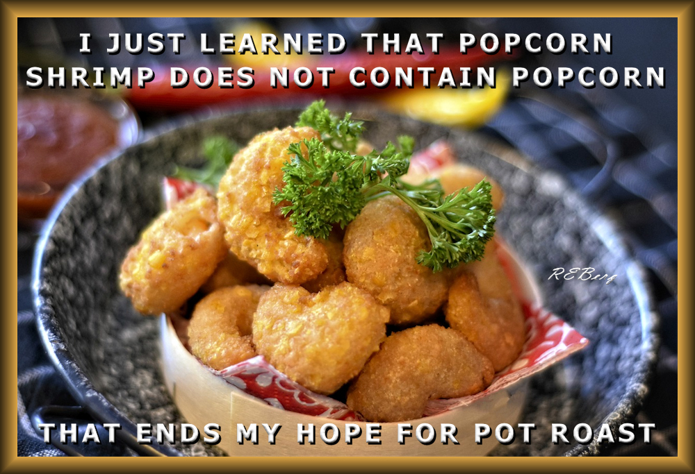 Disillusioning Discovery Image February 27, 2023 R.E. Berg Culinary Curiosities, humor, joke, meme, Punishingly Punny deception, labeling, misnomers, popcorn, pot, roast, shrimp, truth
