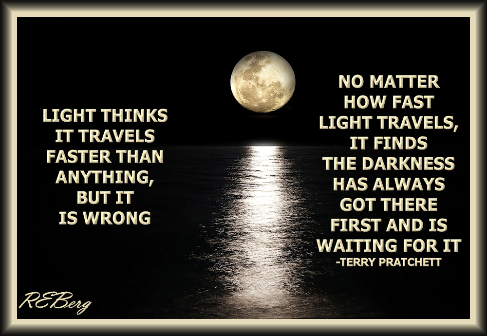 Hello, Darkness Image August 16, 2023 R.E. Berg humor, joke, meme, Mental Gymnastics, Quote Quotient, Random Observations, Scientific Sensibility anything, darkness, faster, first, light, matter, speed, Terry Pratchett, travels, waiting, wrong