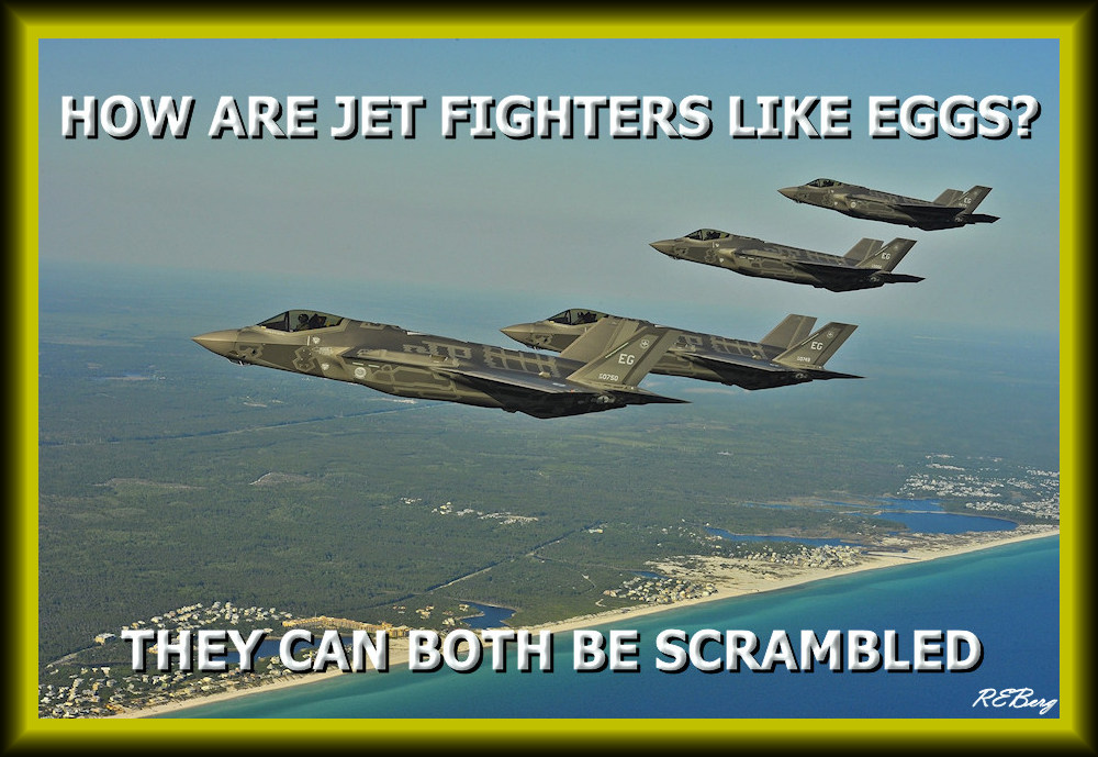 Shell Shock Image February 21, 2024 R.E. Berg Culinary Curiosities, humor, joke, meme, Punishingly Punny Too, Random Observations both, eggs, fighters, jet, like, scrambled