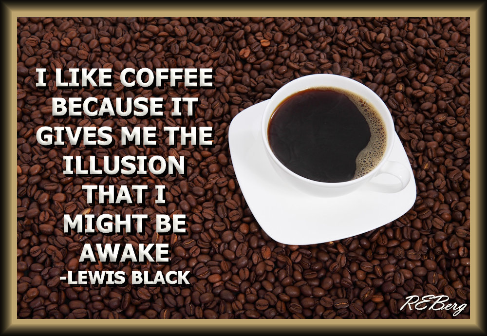 Eye Opener Image October 15, 2024 R.E. Berg Culinary Curiosities, humor, joke, meme, Mental Gymnastics, Quote Quotient, Random Observations awake, coffee, gives, illusion, Lewis Black, like, might