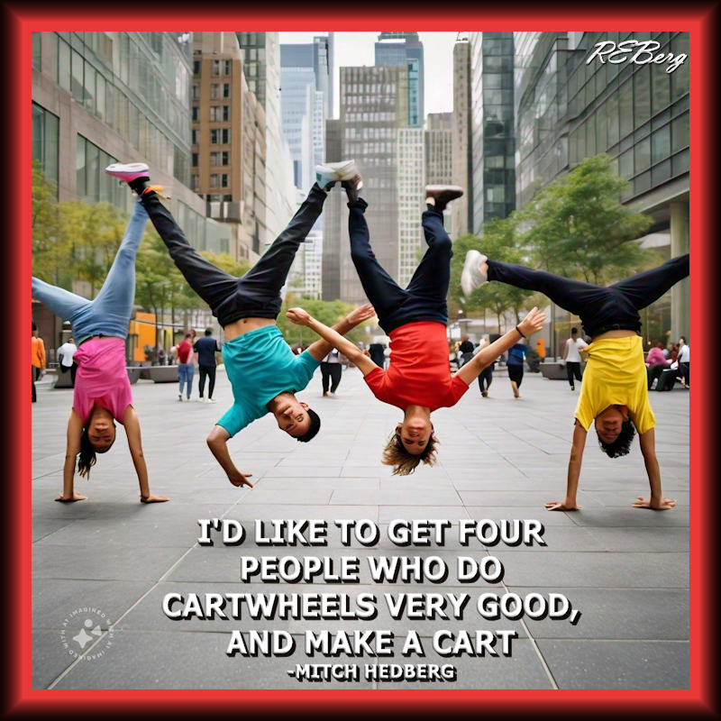 Four-Wheeling Image November 25, 2024 R.E. Berg Fantasy Fitness, humor, Irrational Recreation, joke, Marginal Entertainment, meme, Quote Quotient cartwhieels, city square, four people, like, make a cart, Mitch Hedberg, to get