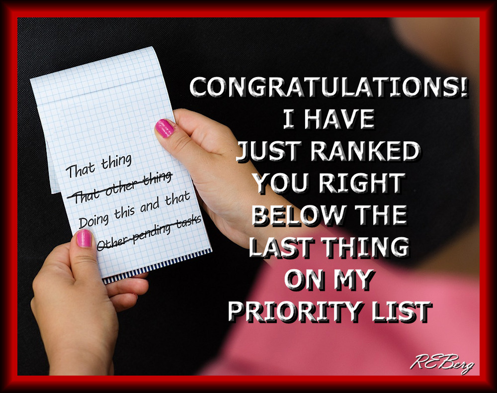 Shortfalling Image May 8, 2023 R.E. Berg humor, joke, meme, Social Hostility below, congratulations, last, list, priority, ranked