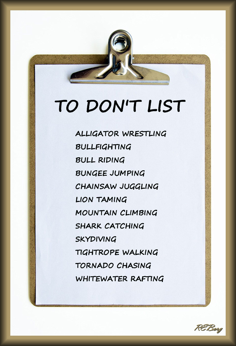 Survival Plan Image December 23, 2023 R.E. Berg Age Management, humor, joke, meme, Random Observations, That's Living alligator wrestling, bull riding, bullfighting, bungee jumping, chainsaw juggling, don't, lion taming, list, mountain climbing, shark catching, skydiving, tightrope walking, tornado chasing, whitewater rafting