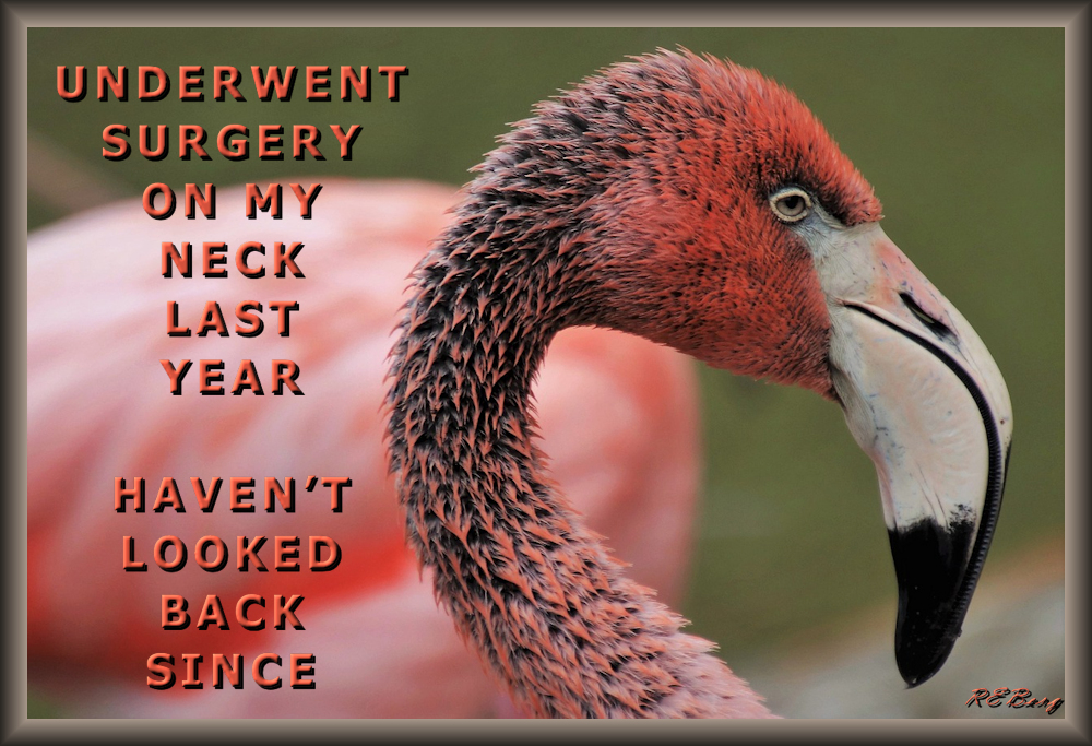 Handicapped Hindsight Image August 22, 2023 R.E. Berg humor, joke, meme, Punishingly Punny back, crooked, flamingo, looked, neck, surgery