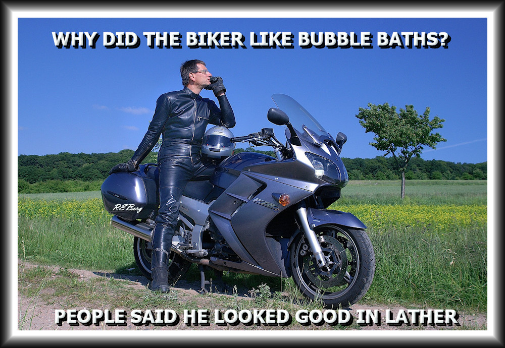 Bodaciously Bubbly Image February 13, 2024 R.E. Berg Fabulous Fashion, humor, Irrational Recreation, joke, meme, Punishingly Punny baths, biker, bubble, good, lather, leather, like, looked, motorcycle, people, said